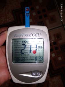 Pada pengecek pertama dilakukan cek gula darah dengan hasil yang Alhamdulillah normal dengan hasil sekitar 100, pengecekan yang kedua kolestrol dilakuan dengan langkah-langkah yang sama juga tetapi hasilnya tidak normal, kolestrol saya cukup tinggi.
