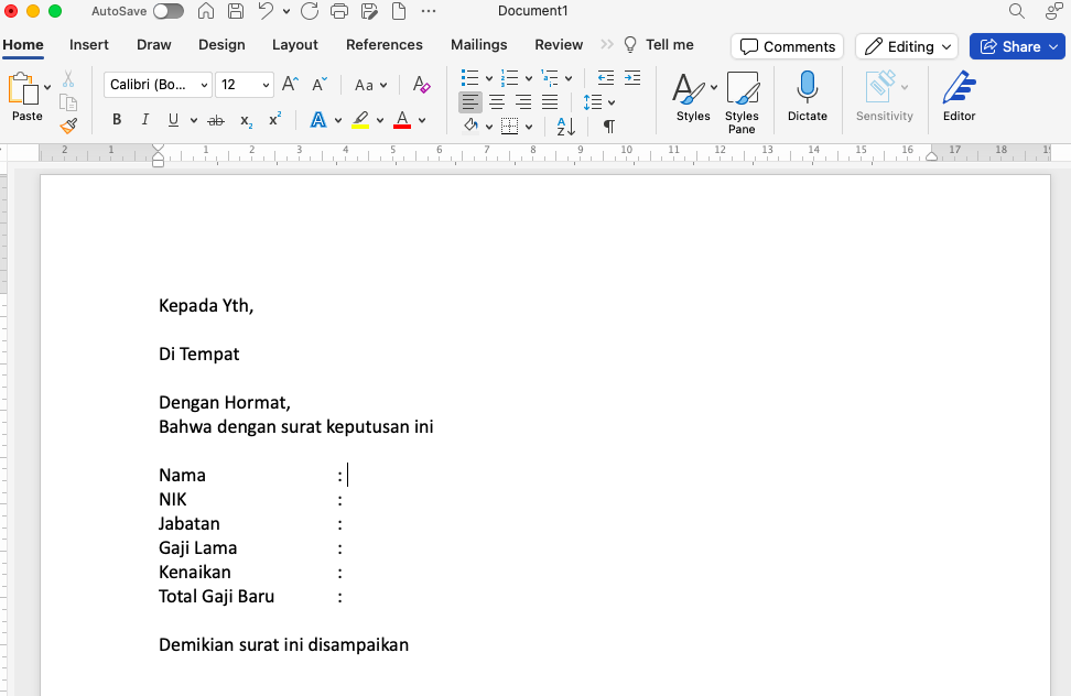 Buatlah surat keputusan seperti biasa, lalu tentukan bagian mana yang akan diisi otomatis. Misalnya: