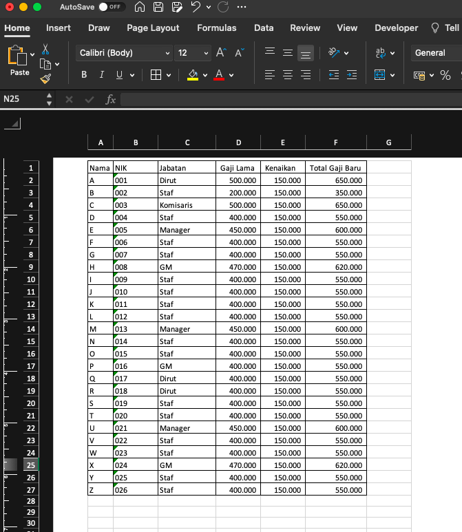 Pastikan file Excel Anda sudah rapi. Baris pertama harus berisi nama kolom seperti: Nama, NIK, Jabatan, Gaji Lama, Kenaikan, Total Gaji Baru