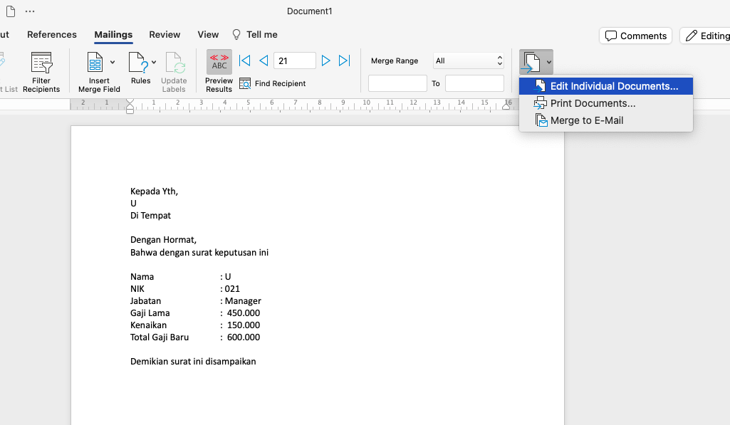 * Pilih Edit Individual Documents untuk menampilkan data semua surat di Word