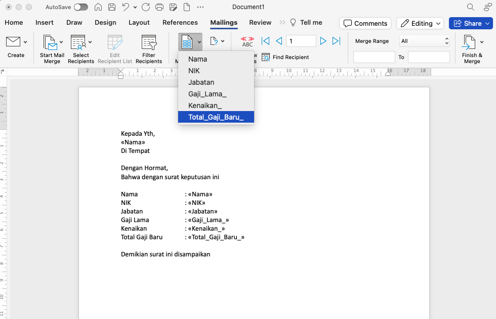 * Klik Insert Merge Field, lalu pilih kolom yang sesuai seperti Nama, Gaji_Lama, Gaji_Baru